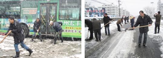 眾志成城,齊抗冰雪。與風(fēng)雪冰凍賽時(shí)間,為了保障出行安全,各車隊(duì)及時(shí)召開緊急會(huì)議,對(duì)司機(jī)加強(qiáng)安全教育。為了保障場(chǎng)站、路面無(wú)積雪凍冰,全員出動(dòng),鏟積雪、撒鹽、蓋稻草,采取一切可以采取的措施,一忙就是幾個(gè)小時(shí),寒風(fēng)大雪都擋不住員工們的熱情。我司一車隊(duì)肩負(fù)著臨平片共10條進(jìn)杭線路的客運(yùn)重任,在全體員工的共同努力下,未發(fā)生一起因冰雪天氣而引發(fā)的擦車事故,車隊(duì)全體員工無(wú)一人遲到、缺勤,所有線路的首班都準(zhǔn)點(diǎn)發(fā)車,真正做到了安全行車、優(yōu)質(zhì)服務(wù),確保了市民的正常、安全出行,得到了大家的一致好評(píng)。二車隊(duì)與五車隊(duì)緊抓夢(mèng)溪大橋這一瓶窯地區(qū)通行咽喉,鑿凍冰、掃積雪,不僅保障了20 多條的公交線路順利通行,還為因上坡打滑而困擾的社會(huì)車輛解決了難題,贏得市民們的嘖嘖稱贊。三車隊(duì)在20日清晨便拋灑工業(yè)用鹽3000斤,確保關(guān)鍵路段無(wú)積雪、不結(jié)冰,車輛通行正常,午后,車隊(duì)所有員工上下一心,不怕苦不怕累,連續(xù)作戰(zhàn),力保6條進(jìn)杭公交線路順利營(yíng)運(yùn),誓與這次雪災(zāi)抗戰(zhàn)到底。四車隊(duì)擔(dān)負(fù)著我區(qū)人數(shù)最多、線路最為繁忙的臨平片客運(yùn)重任。凌晨1點(diǎn),在車隊(duì)管理人員及相關(guān)部門的帶領(lǐng)下,各戰(zhàn)線班組成員冒著嚴(yán)寒摸黑奮斗在客運(yùn)一線,他們不畏艱險(xiǎn),堅(jiān)守崗位,在艱難中風(fēng)雪同舟,團(tuán)結(jié)一致,與冰雪對(duì)抗48小時(shí),都是為了能夠全力保障市民們的出行安全。